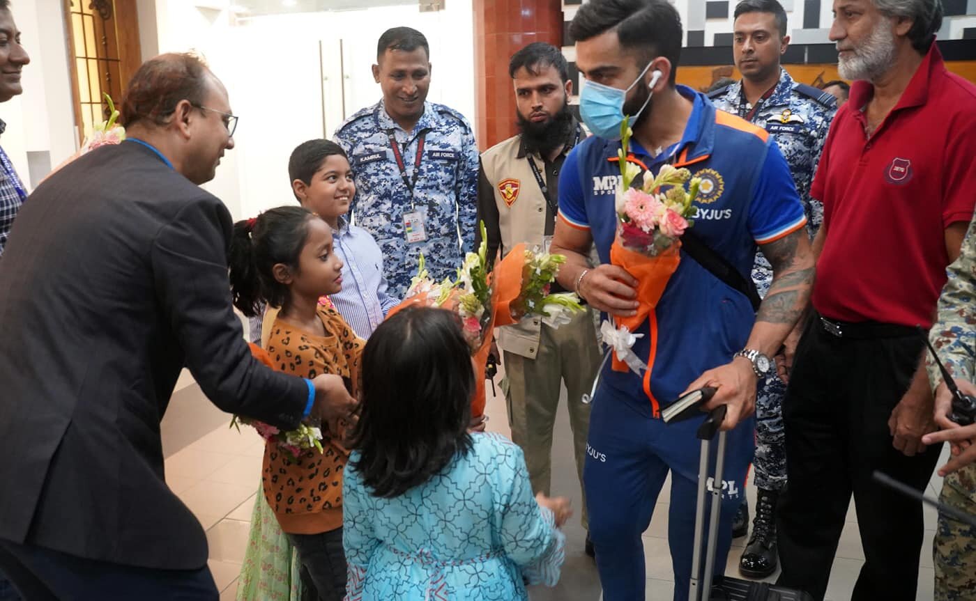 ভারতীয় ক্রিকেটারদের বহনকারী বিমানটি শাহজালাল আন্তর্জাতিক বিমানবন্দরে এসে পৌঁছালে বিরাট কোহলিদের উষ্ণ অভ্যর্থনায় বরণ করে নেওয়া হয়।
